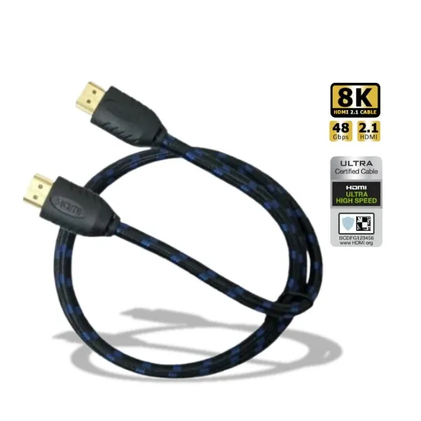 El Cable HDMI 2.1 Ultra Label está diseñado para ofrecer un rendimiento excepcional con soporte para resoluciones de 8K a 60Hz y 4K a 120Hz. Con una longitud de 1 metro, este cable proporciona una tasa de transmisión ultra alta de 48Gbps, garantizando una calidad de video HDR dinámico y 3D, así como audio eARC. Su construcción mallada con funda protectora de nylon asegura durabilidad, mientras que es compatible con HDCP 2.2 y ofrece conectividad Ethernet.