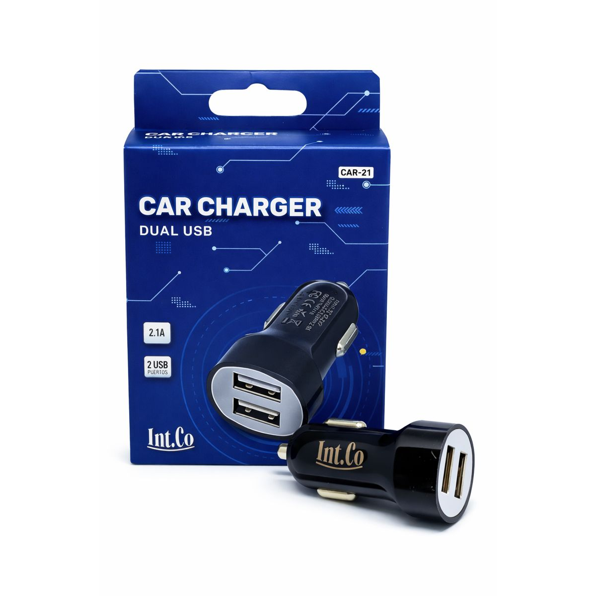 Cargador doble USB para auto que se conecta al toma de carga. Compatible con cualquier cable USB, con entrada de DC 12-24V y salidas: USB 1 (5V-1A) y USB 2 (5V-2.1A). Presentado en blíster.