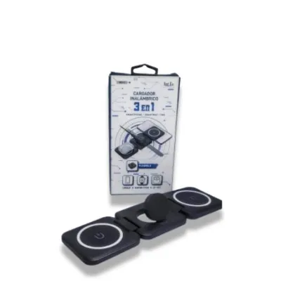 Mantén todos tus dispositivos cargados con este cargador inalámbrico rápido 3 en 1. Su diseño plegable y compacto lo hace ideal para el hogar, la oficina o viajes. Carga tu smartphone, smartwatch y auriculares al mismo tiempo con salidas específicas para cada dispositivo. El imán incorporado asegura una conexión estable durante la carga. Compatible con entradas de 9V/2A y 5V/2A, ofrece una carga segura y eficiente.