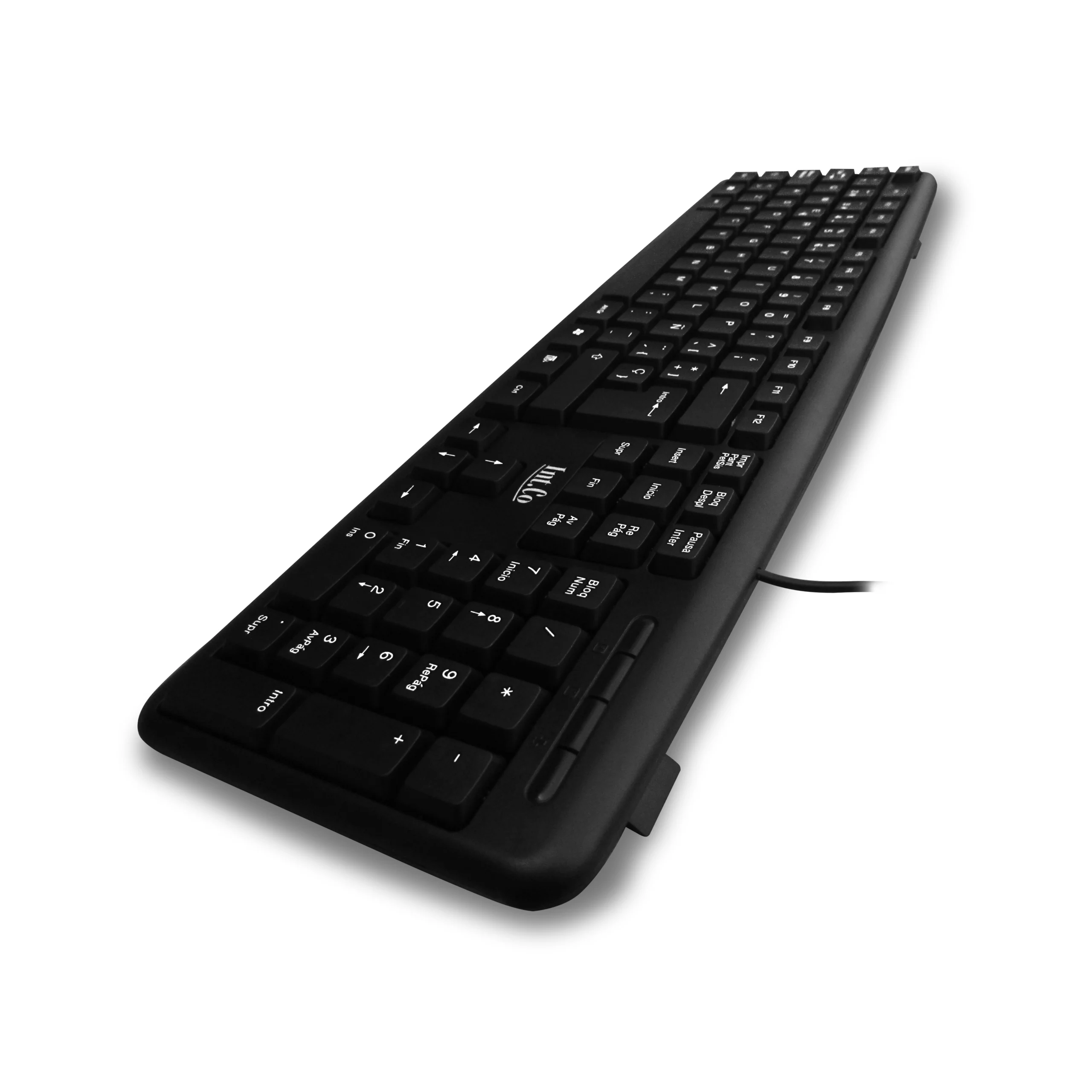 El teclado USB KB300S ofrece un diseño estándar en español con 105 teclas impresas mediante tecnología láser para mayor durabilidad. Con conexión USB y un cable de 1.50 metros, es Plug & Play, lo que asegura una instalación sencilla sin necesidad de software adicional. Mide 429 x 139 x 22.60 mm y viene en color negro.