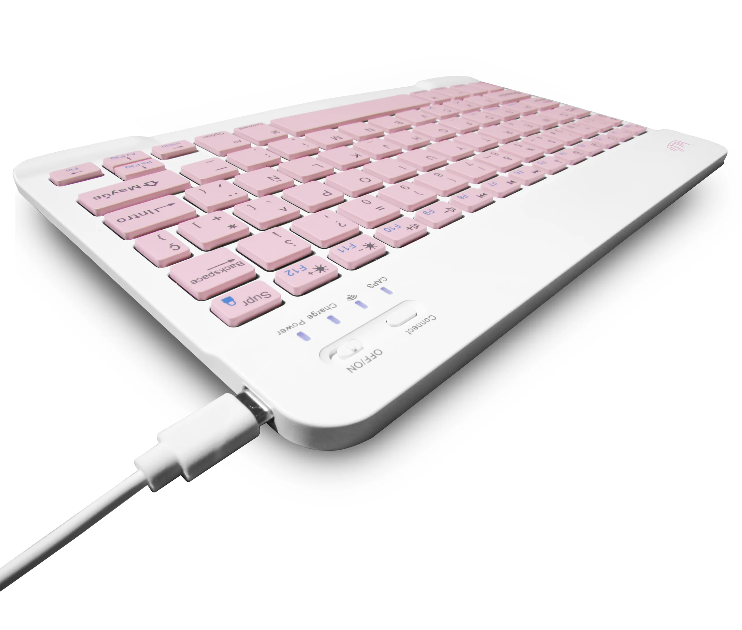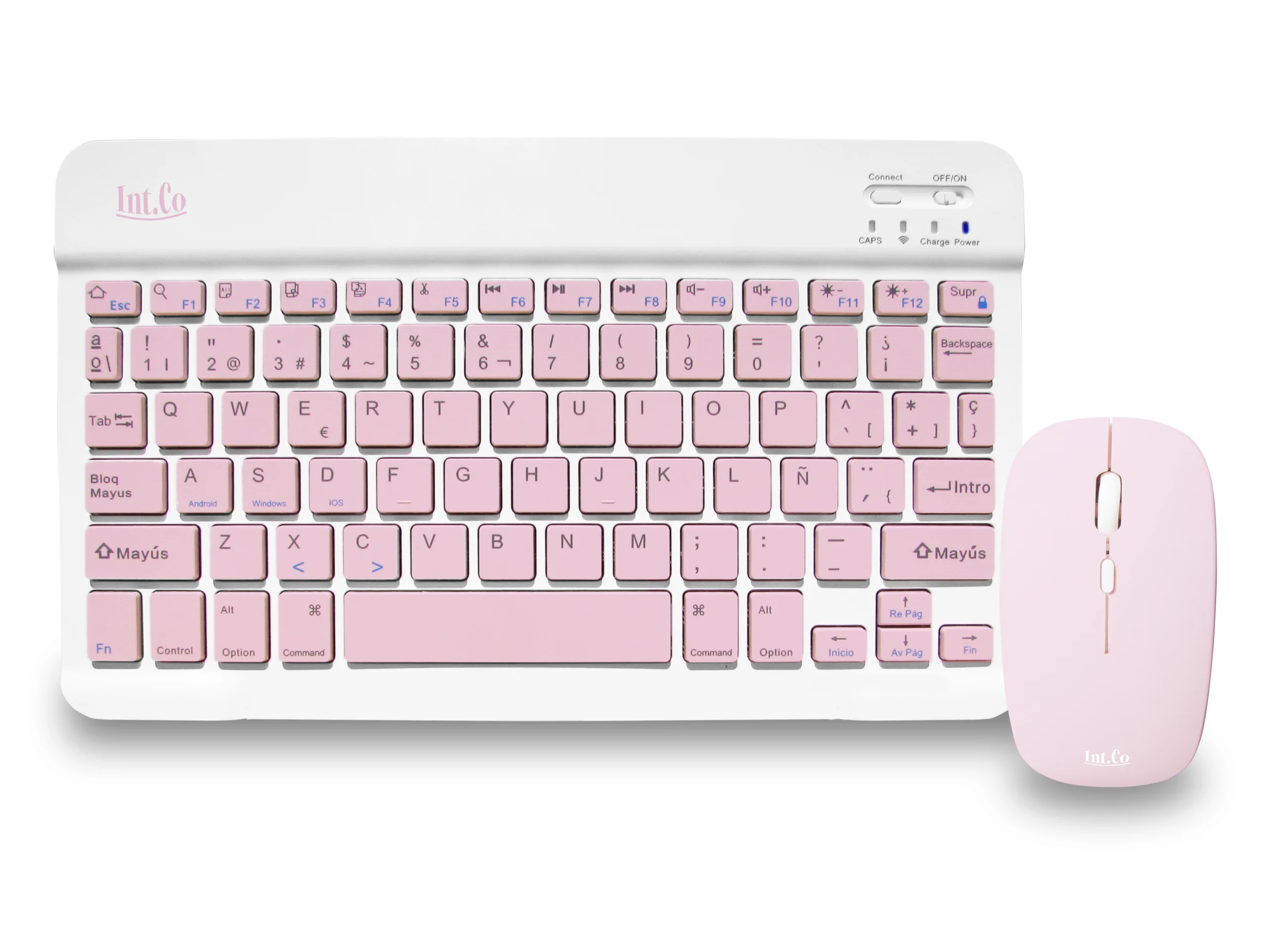 El combo RDKM-906 incluye un teclado y mouse inalámbricos Bluetooth de diseño slim y portable. El teclado cuenta con 78 teclas en español, batería recargable de 150mAh mediante USB C, y un práctico switch ON/OFF con luces indicadoras de carga y batería baja. El mouse slim 4D tiene resoluciones ajustables de 800/1200/1600 dpi y funciona con 2 pilas AAA. Disponible en color rosa.